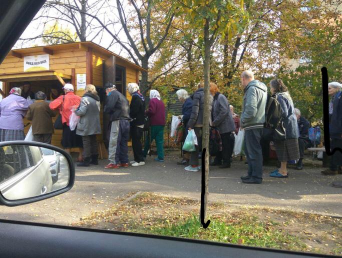 На світлинах – центр міста, «елітний Печерськ», на Перехресті вулиці Бастіонної і Білокур просто люди вишукувались у довжелезну чергу! Це вже не субсидії Гройсмана і не Порошенко роздає цукерки нужденним. Ці люди зовсім не схожі на бомжів, але вони стоять у черзі за безкоштовною їжею! Це звичайні кияни, літні люди у самому центрі «успішної» столиці! Зовсім близько до Державного казначейства України, де влада «зберігає» їхні гроші! І такі акції волонтери проводять по усьому місту за зібрані кошти небайдужих!